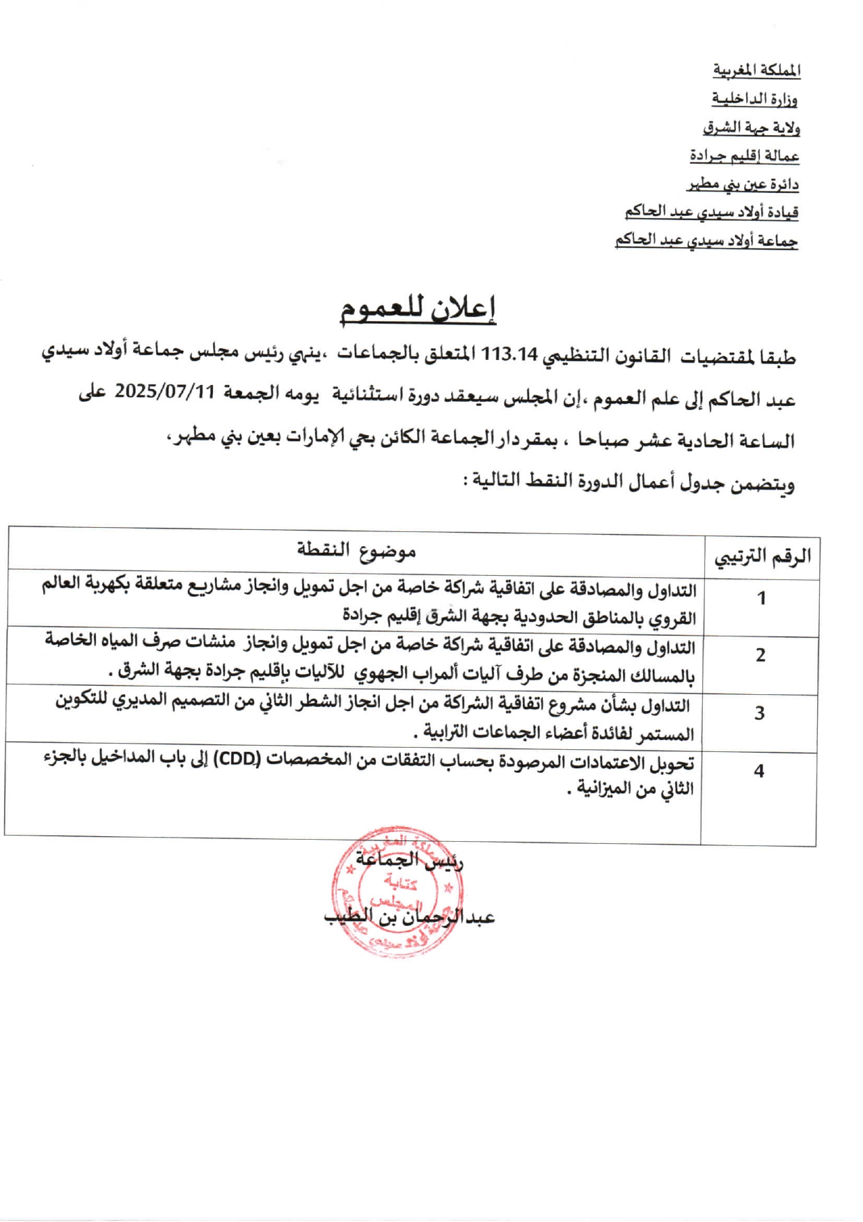 طبقا لمقتضيات القانون التنظيمي 113.14 المتعلق بالجماعات عقد المجلس دورة استثنائية يومه الجمعة11-02-2025 على الساعة 11 صباحا.